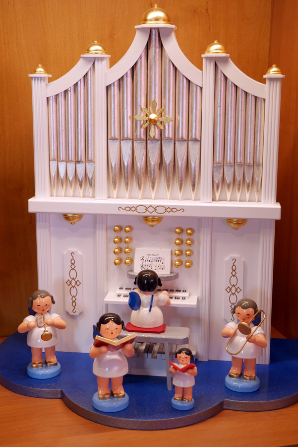 Der Klassiker unter den Engeln ist der Violinenengel mit blauen Flügeln. Ursprünglich trugen alle Engel blaue Flügel mit einer goldenen Schraffur. Die Uhligs wollten sich damit von anderen Herstellern abheben und entschieden sich bewusst gegen grüne Flügel. Neben der Violine spielen unsere Klassiker so ziemlich alles was ein Orchester hergibt: von den Trompeten, über die Querflöten bis hin zu den Pauken.
